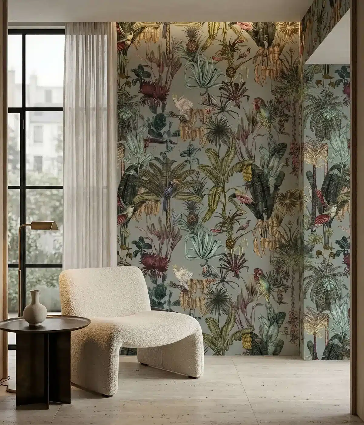 Nature wallpaper complements a wide range of interior styles including Scandinavian interiors, contemporary homes and nature-inspired spaces where natural materials and soft colours define the atmosphere. Wood, stone, linen and ceramic elements work beautifully with nature wallpaper and wall murals.