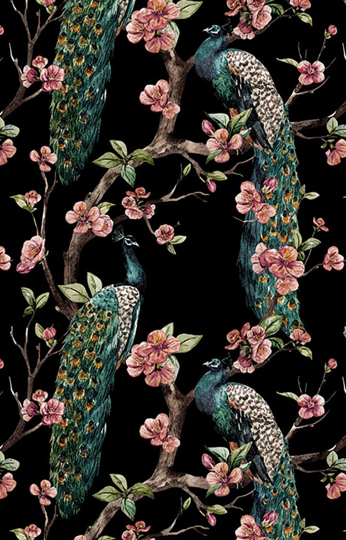 In the Enchanted Garden (Jungle Bird I) wallpaper, viewers can enjoy looking at hand painted gorgeous peacocks as they perch on branches with pastel coloured flowers. This black & green jungle bird wallpaper captures modern sophistication while offering a vintage design.